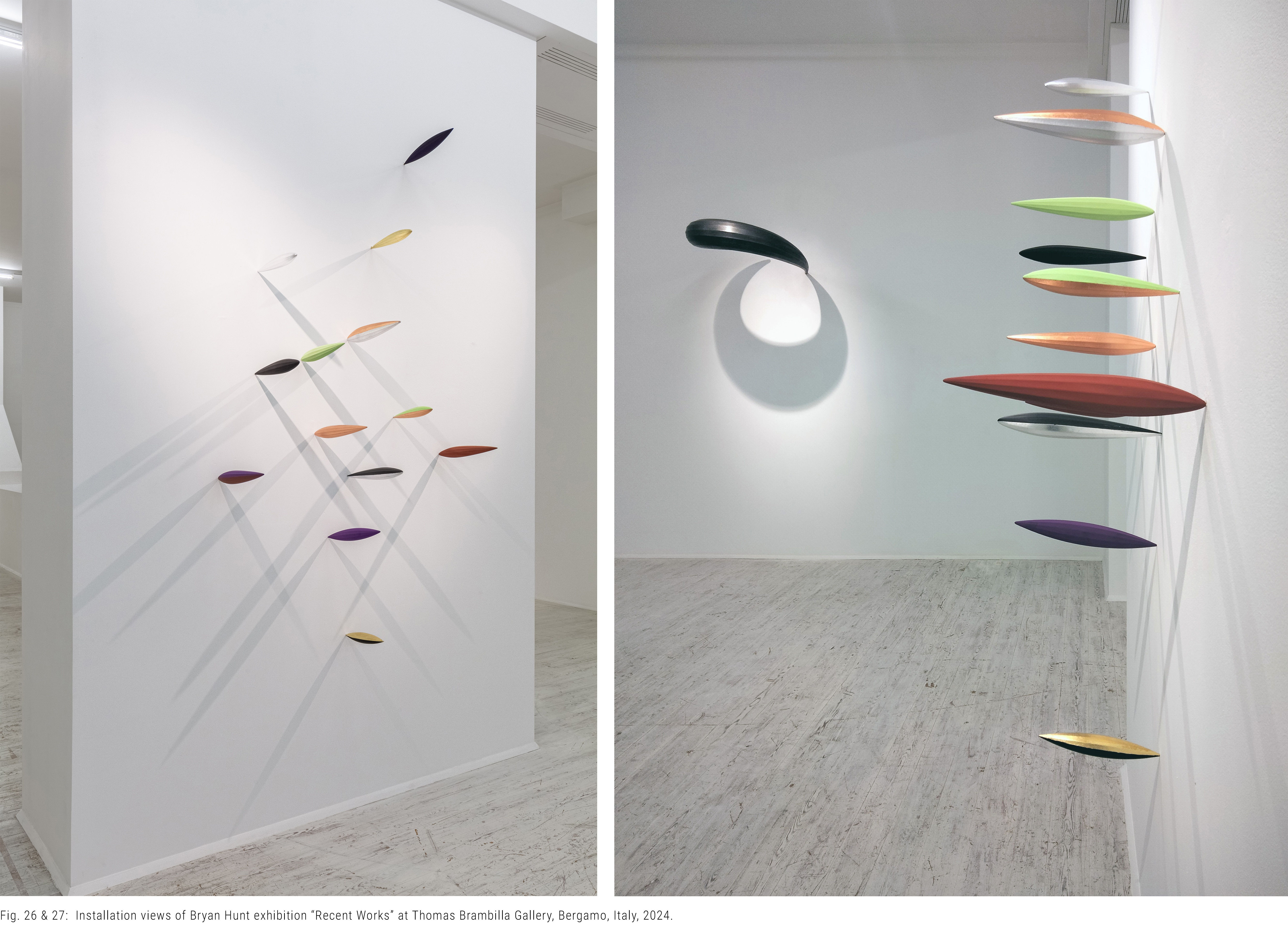 Over the past years, Hunt has further developed the concept of Airships, which has evolved into his more recent Pods series which are installations of small, colorful, glossy dirigible-shaped structures, mounted on the wall [fig. 26, 27]. These Pods evoke lightness and fluidity, extending the artist’s enduring exploration of the relationship between architecture, aeronautics, and philosophy. Hunt’ unique motif not only reflects his innovative vision but also embodies a sustained investigation into the dynamic interplay between form, space, and the viewer's experience.