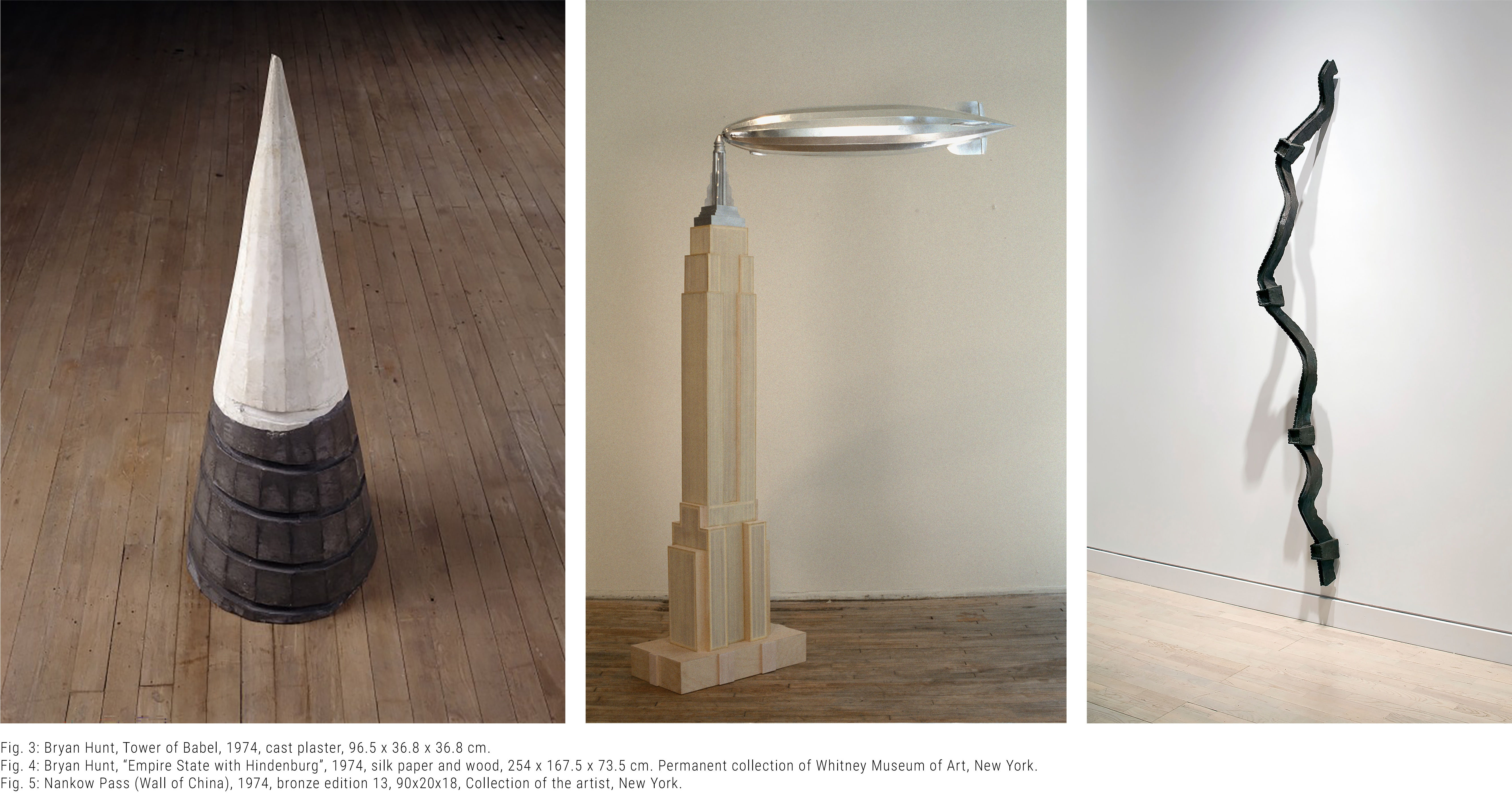 Between 1974 and 1975, Hunt created several pivotal sculptures that marked a shift in his artistic direction and laid a strong foundation for his work in the years that followed. These included Empire State with Hindenburg (1974), Nankow Pass (Wall of China) (1974), Tower of Babel (1974), Hoover Dam (1975), Phobos (1975), and the first in a series of Airships. These works blended art, science, technology, and philosophy, reflecting Hunt's evolving vision [fig. 3, 4, 5].