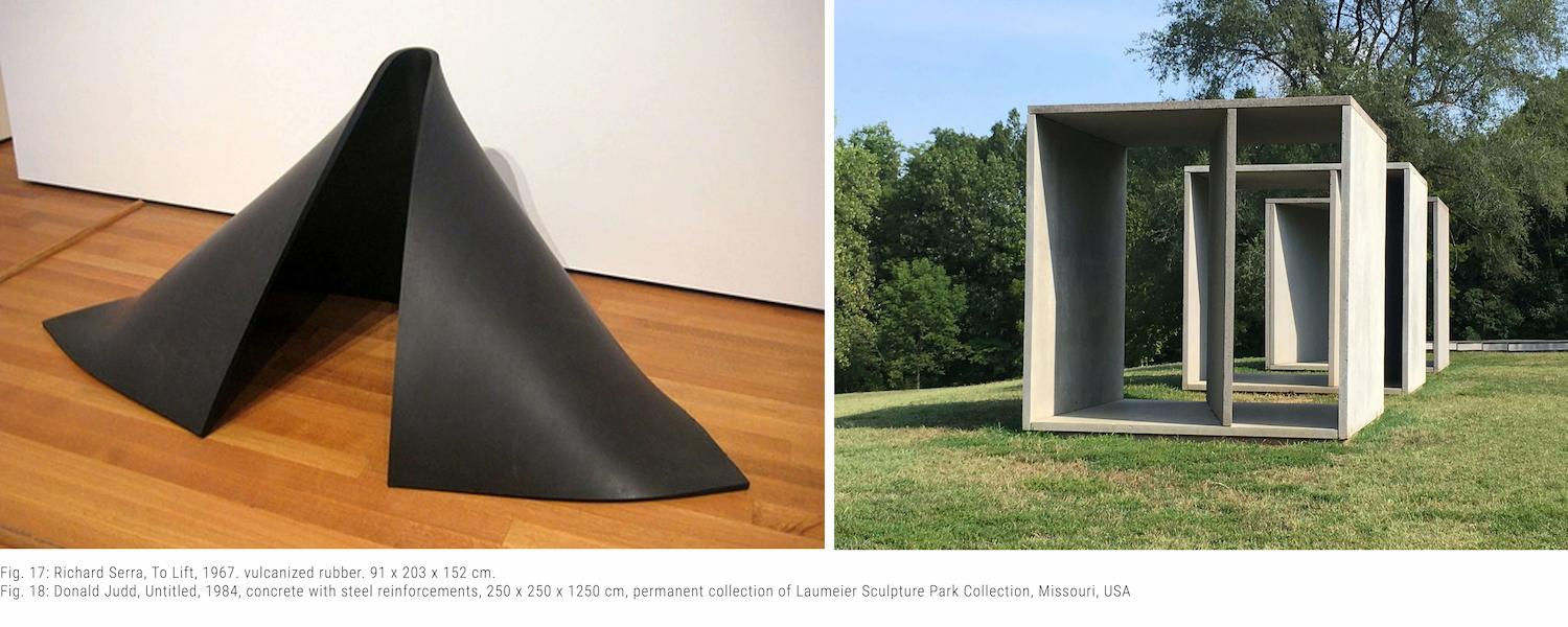 Like the earlier works, the Airships reach into the room and silently float in space, seemingly weightless yet precisely tuned to human scale. Out of human reach but still resonating with human presence, they reflect Hunt's interest in blending the monumental with the intimate. As with many artists of the mid-Seventies, Hunt often used industrial or found materials, in a manner similar to Richard Serra [fig. 17], Donald Judd [fig. 18], and John Chamberlain [fig. 19], who incorporated industrial metals or wrecked cars into their work.