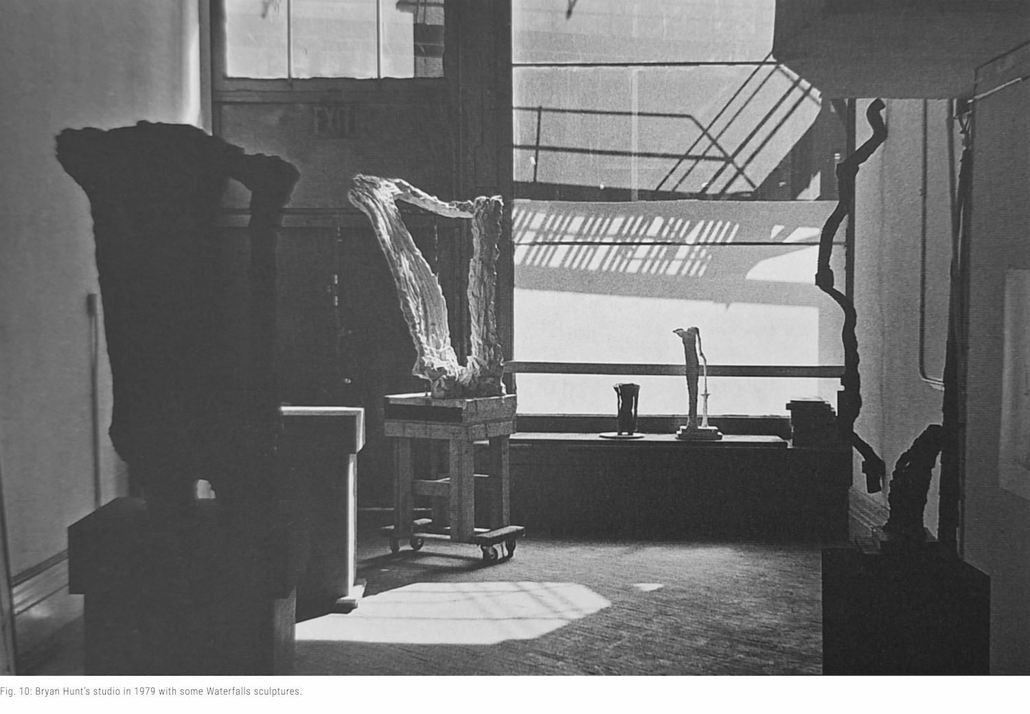 Although Hunt wasn’t interested in pursuing a full engagement with the Earthworks movement, he was drawn to the concept of monumental scale and sought to incorporate this into his own work. However, instead of embracing the expansive, land-based forms of Earthworks, he aimed to do so through more compact, classical sculptural forms. The Empire State with Hindenburg was crucial in this regard because it established a dialogue between large-scale, sculptural space and the natural world. He would continue in this manner with plaster and bronze pieces in the shape of quarries [fig. 8], lakes [fig. 9] and waterfalls [fig. 10-14] that captured and isolated fluid fragments of nature, giving them permanence.