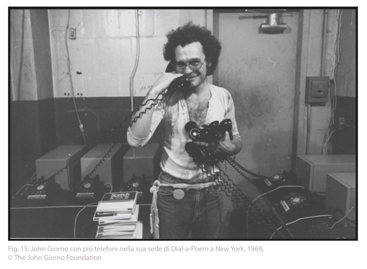 Nel 1968, John Giorno ideò Dial-A-Poem, un progetto pionieristico che trasformò il telefono in uno strumento di diffusione poetica su larga scala [fig. 15]. Nato all’interno dell’Architectural League di New York, il progetto fu poi presentato nel 1970 al Museum of Modern Art (MoMA), all’interno della storica mostra Information, dedicata ai nuovi linguaggi concettuali e mediali dell’arte contemporanea.