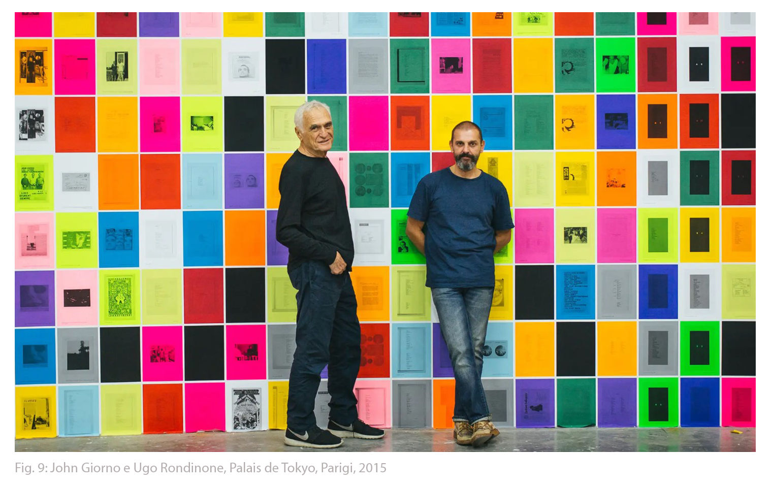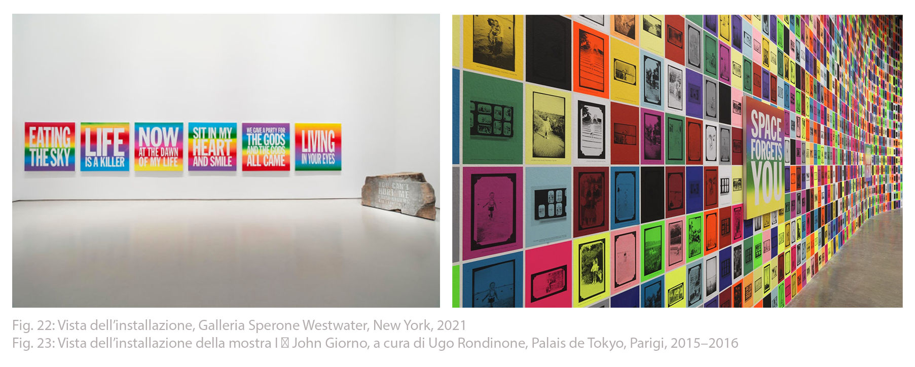 Questa serie fu protagonista della grande retrospettiva I ♥ John Giorno -precedentemente citata- al Palais de Tokyo di Parigi, dove i Rainbow Paintings servivano da congiunzione tra parola e colore, offrendo al pubblico un’esperienza sinestetica capace di attraversare cinquant’anni di sperimentazioni poetiche e visive. In quel contesto, le opere assumevano anche un valore più intimo e personale, rappresentando simbolicamente l’unione – artistica ma anche affettiva – tra Giorno e Ugo Rondinone, suo compagno di vita e curatore della mostra [fig. 23].