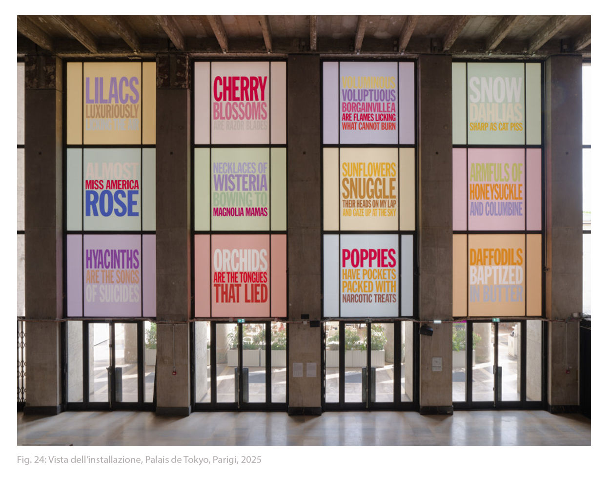 Da questo nucleo poetico nacque anche il ciclo dei Perfect Flowers, una serie di lavori luminosi caratterizzati da superfici scintillanti. In questi dipinti, i testi dell’artista – poesie concise incentrate sui cicli della vita – vengono amplificati dal colore e dalla luce, espandendosi oltre l’analisi letterale per affrontare temi universali come la nascita, la morte e la reincarnazione [fig. 25, 26].