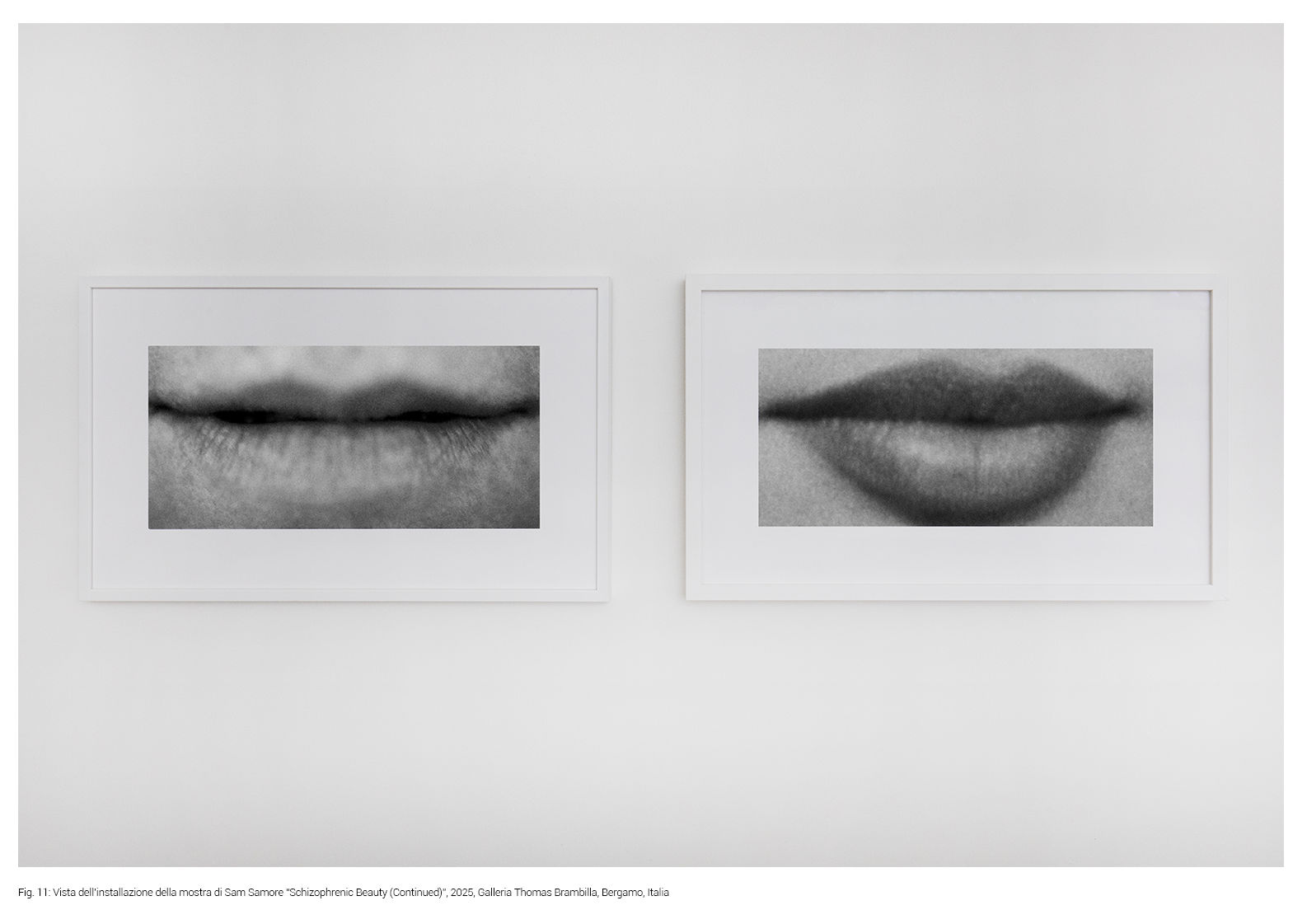 Dagli anni Ottanta, con lavori come Situations, l’artista concentra la sua attenzione sulla figura umana, ritratta in gesti ordinari ma caricati da una tensione narrativa latente, quasi cinematografica [fig. 13-14]. Col tempo, il suo sguardo si restringe su dettagli sempre più intimi, fino a eleggere occhi e labbra a veri protagonisti della sua ricerca. Un ulteriore approfondimento di questo linguaggio si trova in Allegories of Beauty (Incomplete) (anni ’90), dove volti e bocche femminili appaiono avvolti in un bianco e nero denso e incompiuto. Sono immagini sospese che alludono a un ideale di bellezza irraggiungibile, destinata a sfuggire proprio nel momento in cui sembra manifestarsi.
