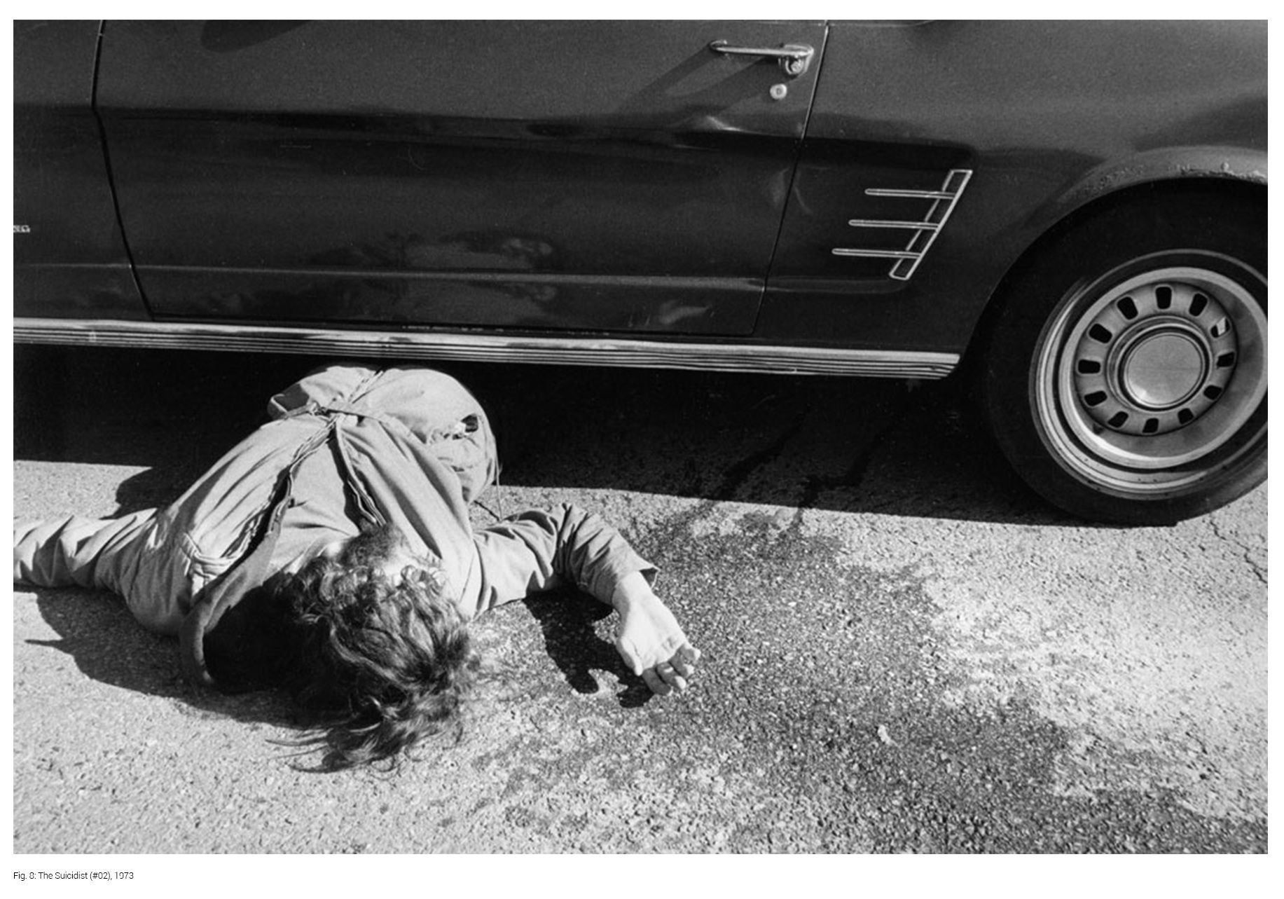 Il percorso artistico di Samore prende avvio con The Suicidist (1973), una serie di autoritratti in bianco e nero in cui l’artista mette in scena la propria morte in diverse situazioni, come sequenze tratte da un film noir immaginario [fig. 7-8]. Queste immagini, riprese e presentate anni dopo al MoMA PS1 di New York, rivelano da subito la sua inclinazione a trasformare la fotografia in narrazione, mescolando ironia, tensione e tragedia. Già qui è evidente il suo interesse per la teatralità del volto e del gesto, un terreno che negli anni successivi lo porterà a concentrare la sua attenzione su occhi e labbra come elementi simbolici ed emotivi.